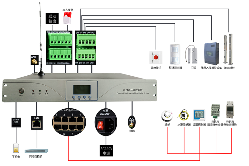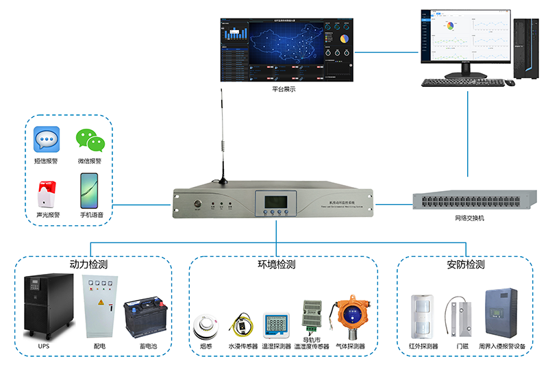 動環主機是一款集動力環境監控功能及入侵防盜報(bào)警於(yú)一體的設備,可實時監測機房、基站等場所的動力設備運行狀态、環境參數 、入侵報(bào)警,如市電、UPS、蓄電池、溫濕度、煙霧、漏水、門禁